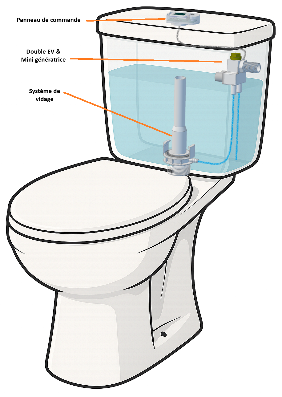 Grace à son système de commande hydraulique, E4Flush assure sa propre autonomie énergétique. Le débit de remplissage induit par l’électrovanne permet l’entrainement d’une mini génératrice. Celle-ci assure le rechargement de la batterie tampon du système de contrôle et confère une autonomie prolongée.